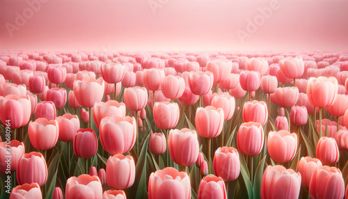 Wall mural vast field of pink tulips under a soft rose tinted sky. floral abundance concept. generative ai