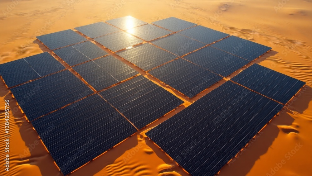 The watermark will not be included on Wall mural.: Vast solar array in the desert captured by drone in a surreal and vibrant cinematic style showcasing