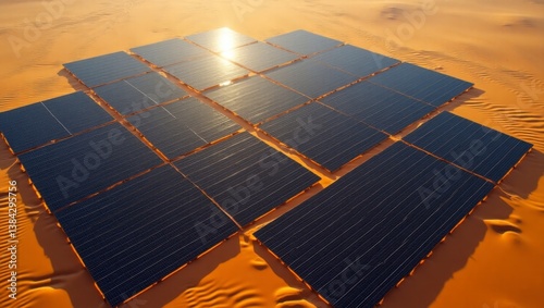 Wall mural : Vast solar array in the desert captured by drone in a surreal and vibrant cinematic style showcasing