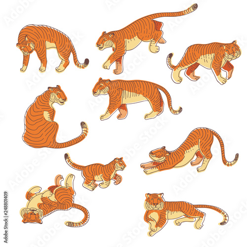 Vectoe set of hand drawn tigers in different actions - large predatory cat with orange striped coat - Wall mural
