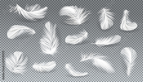 The watermark will not be included on Wall mural.: Vector 3d realistic set of white bird or angel feathers in various shapes, isolated on transparent b