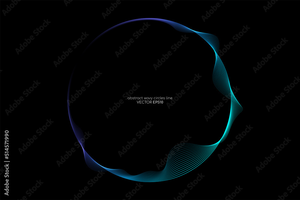 Vector abstract circle frame with wave lines pattern flowing in blue green colors isolated on black Wall mural