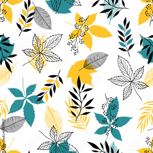 Wall mural : Vector autumn pattern with leaves - scandinavian style - linear boho sketch - blue and yellow colors