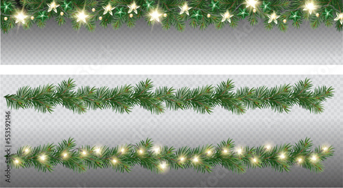 Wall mural : Vector border with green fir branches and with festive decoration elements on transparent background
