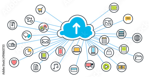 Wall mural vector flat line modern simple design illustration concept of saving cloud service with branches and - Wall murals Wall mural vector flat line modern simple design illustration concept of saving cloud service with branches and - Wall murals