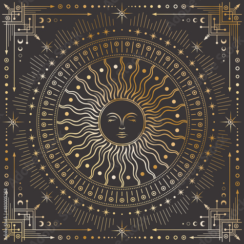 The watermark will not be included on Wall mural.: Vector golden celestial background with an ornate geometric frame with arrows, stars and crescents -