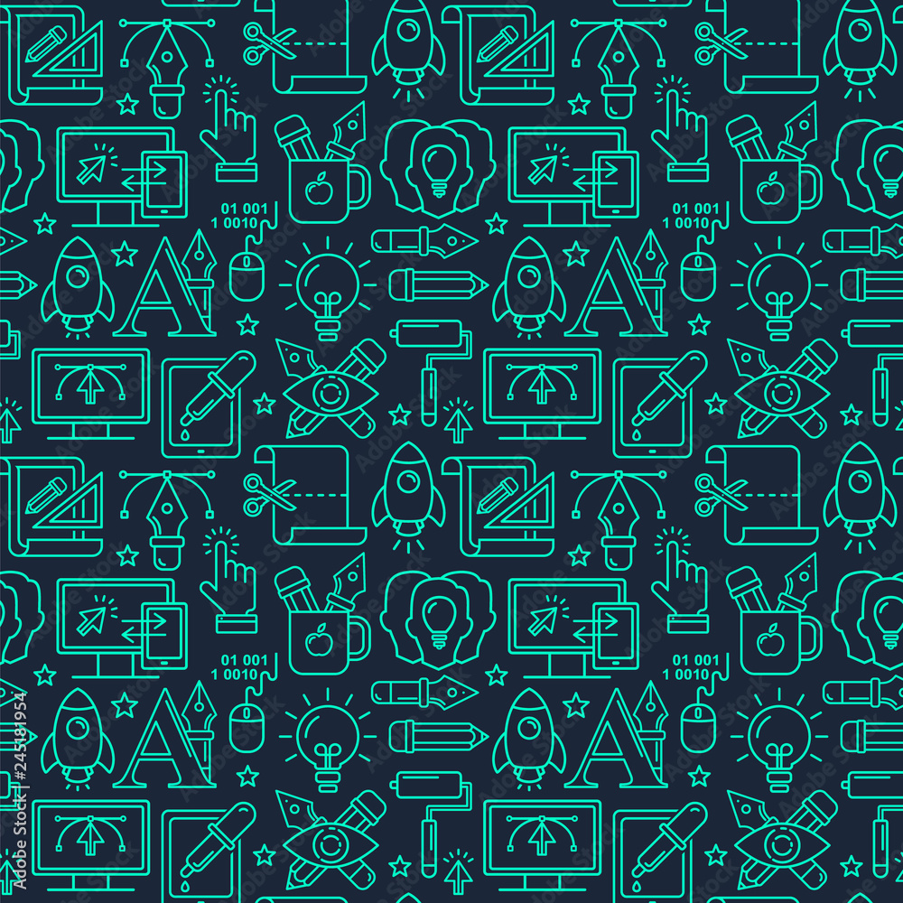 Vector graphic design seamless pattern with linear icons - line style designer background with place Wall mural