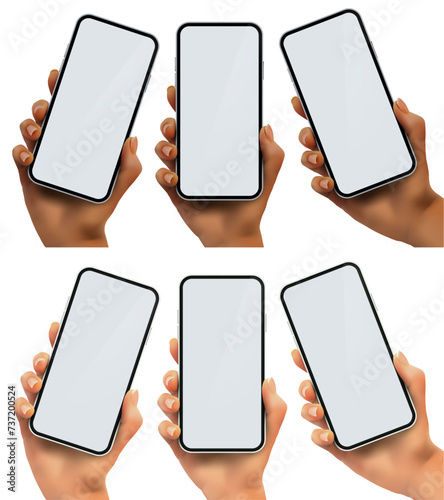 Wall mural : Vector hand templates with smartphones displaying empty screens, including black and white versions -