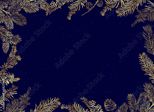 Wall mural vector horizontal frame of christmas background with branches of christmas tree and golden elements.