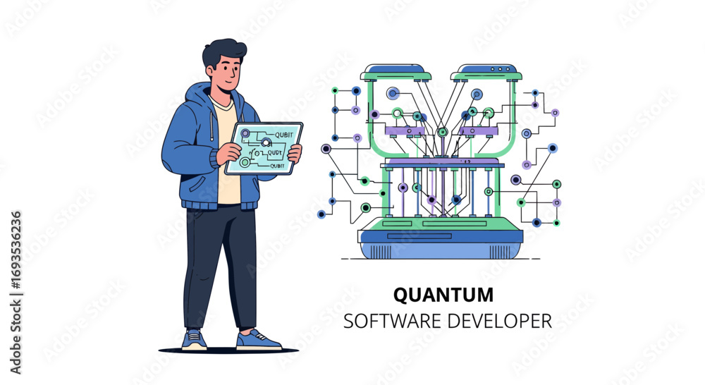 Wall mural vector illustration of a quantum software developer holding a tablet next to a quantum computing sys - Wall murals Wall mural vector illustration of a quantum software developer holding a tablet next to a quantum computing sys - Wall murals