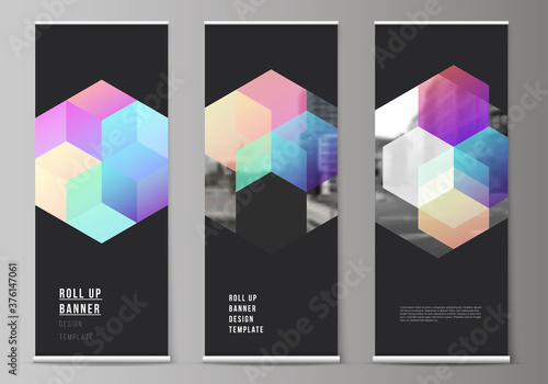 The watermark will not be included on Wall mural.: Vector layout of roll up mockup design templates with colorful hexagons, geometric shapes, tech back