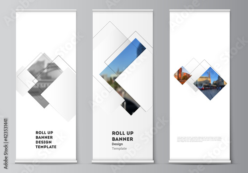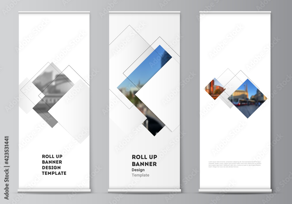 The watermark will not be included on Wall mural.: Vector layout of roll up mockup design templates with geometric simple shapes, lines and photo place