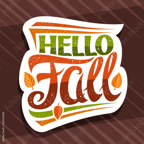 Wall mural vector lettering hello fall, white label with curly calligraphic font, illustration of decorative fa