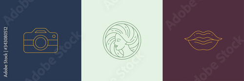 The watermark will not be included on Wall mural.: Vector line decoration design elements set - female face and lips illustrations simple linear style