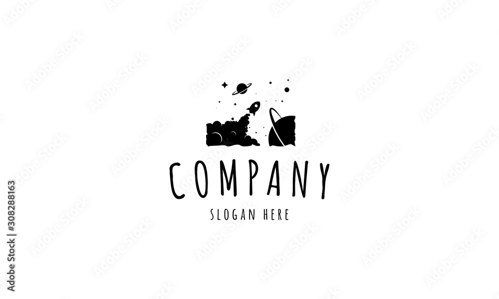 Wall mural vector logo on which an abstract image of a flying rocket on the background of planets and stars.