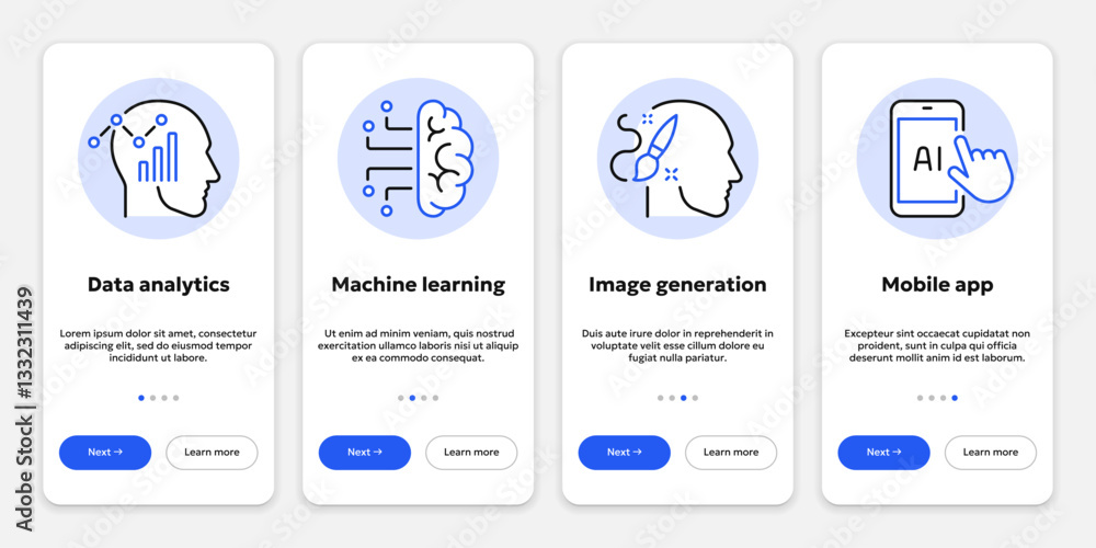 Wall mural vector onboarding screens or cards of artificial intelligence containing data analytics, machine lea