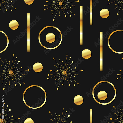 Wall mural Vector seamless abstract background with gold foiled elements on black background. Beautiful repeating pattern with geometric shapes. Chic and luxury endless wallpaper with abstract gold objects.