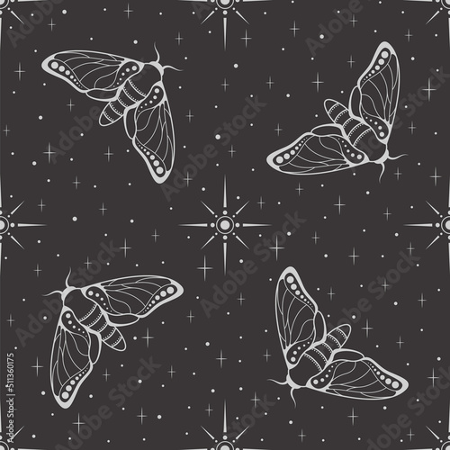 The watermark will not be included on Wall mural.: Vector seamless dark celestial pattern with stars and moth on a black - butterfly illustration - esote