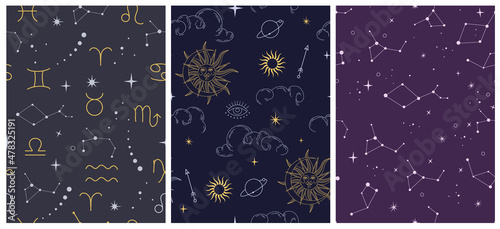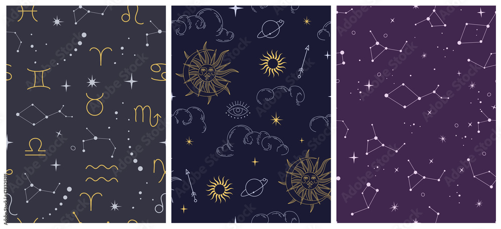 Wall mural : Vector seamless pattern with celestial mystic esoteric magic elements sun moon and clouds different