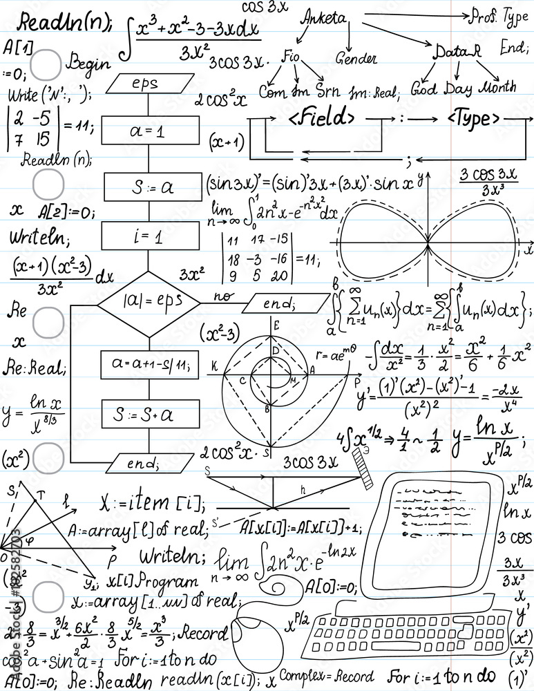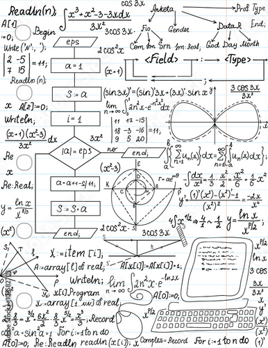 The watermark will not be included on Wall mural.: Vector seamless pattern with mathematical formulas and programming code, "handwritten on the linear