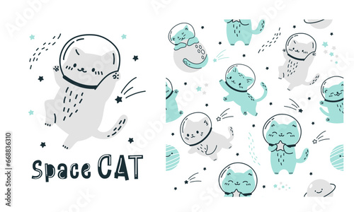 Vector set for printing on children's products - seamless pattern and print for printing - cats in spaWall mural