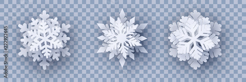 Wall mural vector set of 3 white christmas paper cut 3d layered snowflakes with shadow on transparency backgrou