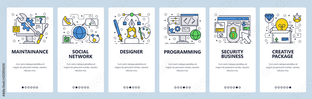 Wall mural vector web site linear art onboarding screens template. designer, website coding, business security. - Wall murals Wall mural vector web site linear art onboarding screens template. designer, website coding, business security. - Wall murals
