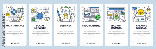 Wall mural : Vector web site linear art onboarding screens template - designer, website coding, business security -