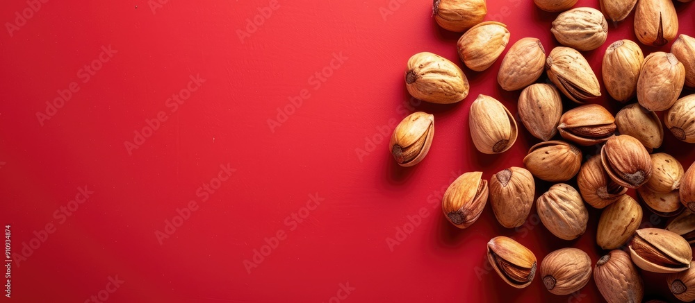 The watermark will not be included on Wall mural.: Vegan nut placed on red backdrop with copy space image high in vitamin content
