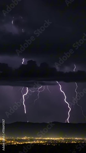 The watermark will not be included on Wall mural.: Vertical 9:16 dark storm clouds with multiple lightning strikes flashing in the distance - the sky is