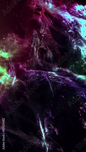 The watermark will not be included on Wall mural.: Vertical abstract space glow flight 4k loop features abstract red, yellow, purple, and blue liquid l