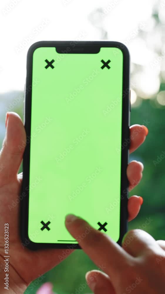 Wall mural : Vertical format video of woman's hand holding mobile telephone with vertical green screen chroma key