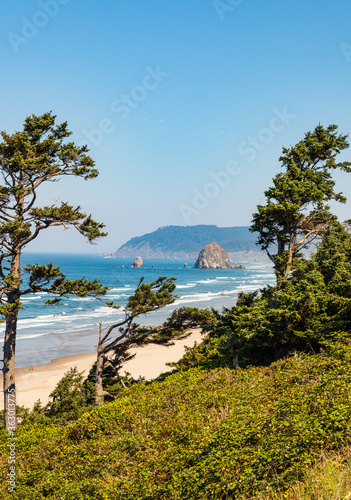 Wall mural vertical image - green trees frame view of haystack rock and cannon beach in oregon