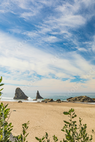 The watermark will not be included on Wall mural.: Vertical image - greenery frames view of sea stacks on bandon beach
