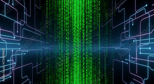 The watermark will not be included on Wall mural.: Vertical matrix of green binary code between blue circuit lines image photo