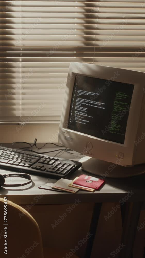 Wall mural vertical no people lowkey shot of desk in front of window with shut window blinds and old computer m - Wall murals Wall mural vertical no people lowkey shot of desk in front of window with shut window blinds and old computer m - Wall murals