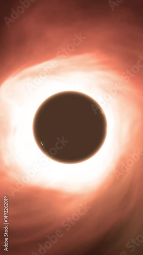The watermark will not be included on Wall mural.: Vertical top down view of black hole with glowing bright accretion disk swirling around and strong g