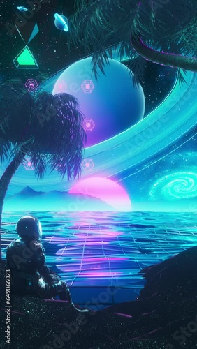 Vertical video retrowave synthwave loop animation with astronaut ocean and planet - perfect for sociWall mural