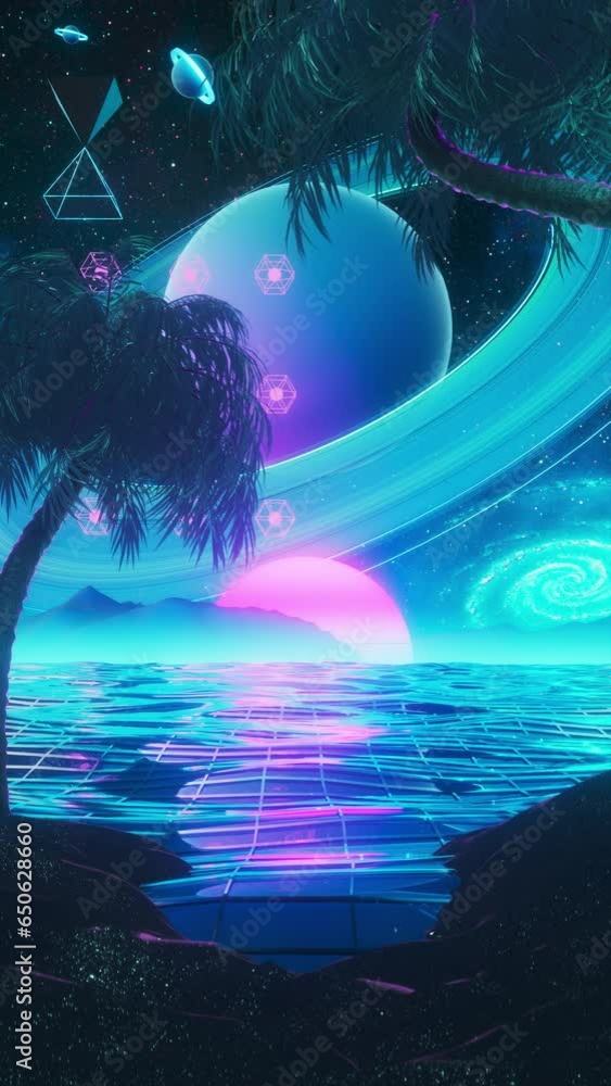 The watermark will not be included on Wall mural.: Vertical video retrowave synthwave loop animation with neon ocean, planet, and galaxy