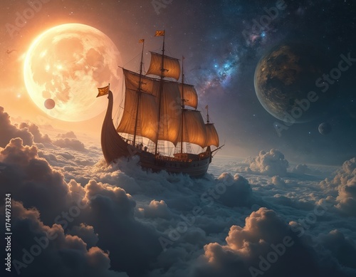 Wall mural Vessel sails through cosmic clouds. Ship with sails floats on fog. Glowing moon and planets in space background. Stars and galaxy in distance. Fantasy scene with sailing boat in nebula.
