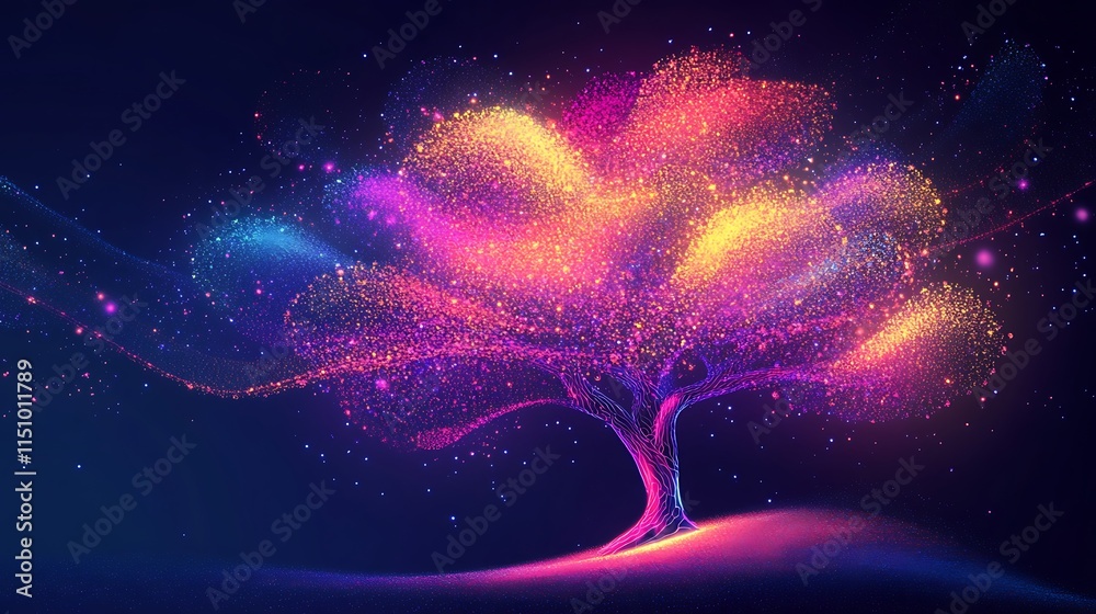 The watermark will not be included on Wall mural.: Vibrant, glowing tree with colorful particles on dark background -