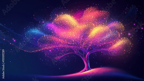 Wall mural : Vibrant, glowing tree with colorful particles on dark background -
