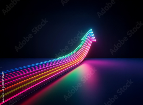 The watermark will not be included on Wall mural.: Vibrant, multicolored neon arrows ascend in a dynamic, upward trajectory against a dark background,