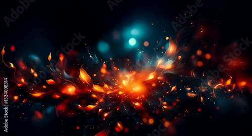The watermark will not be included on Wall mural.: Vibrant abstract shapes explode with fiery orange and red against a dark backdrop - teal bokeh lights