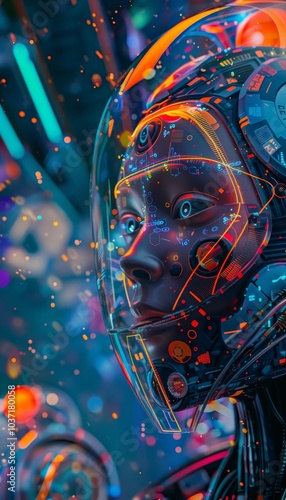 Wall mural vibrant ai background featuring robots, data visualization, and smart devices in digital space - Wall murals Wall mural vibrant ai background featuring robots, data visualization, and smart devices in digital space - Wall murals