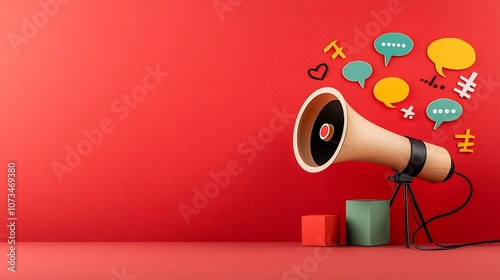 Wall mural : Vibrant and colorful featuring a single megaphone with floating speech bubbles on a solid red backgr