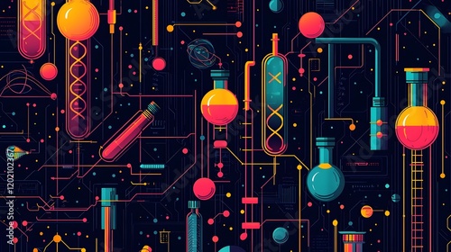 The watermark will not be included on Wall mural.: Vibrant and minimalist graphic design featuring an assortment of laboratory instruments such as beak