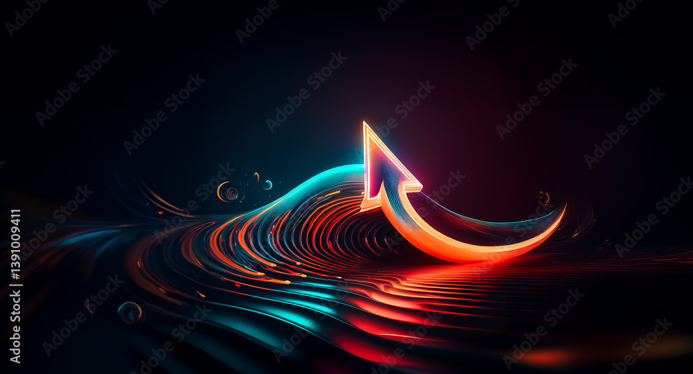 The watermark will not be included on Wall mural.: Vibrant arrow of light emerges from swirling waves against a dark backdrop, creating a dynamic and f