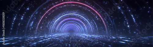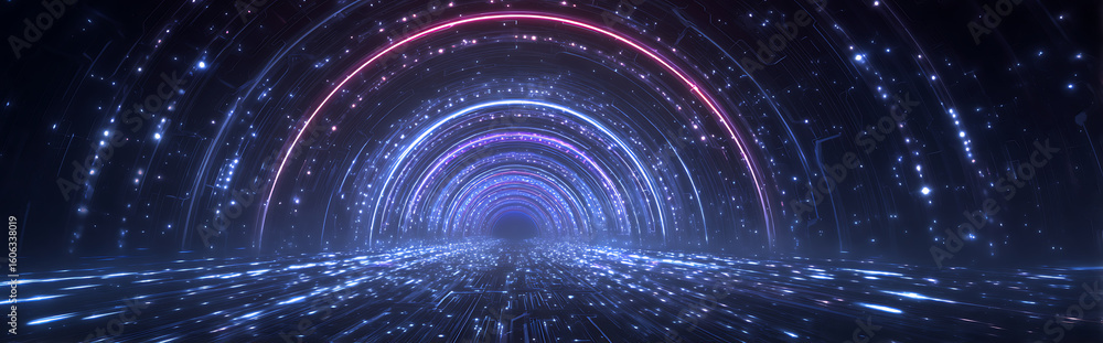 The watermark will not be included on Wall mural.: Vibrant blue-purple gradient particle flows forming an endless tunnel with glowing circuit patterns,