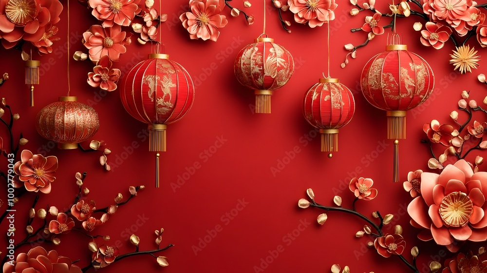 The watermark will not be included on Wall mural.: Vibrant chinese new year red backdrop with intricate patterns festive lanterns and symbols of luck a